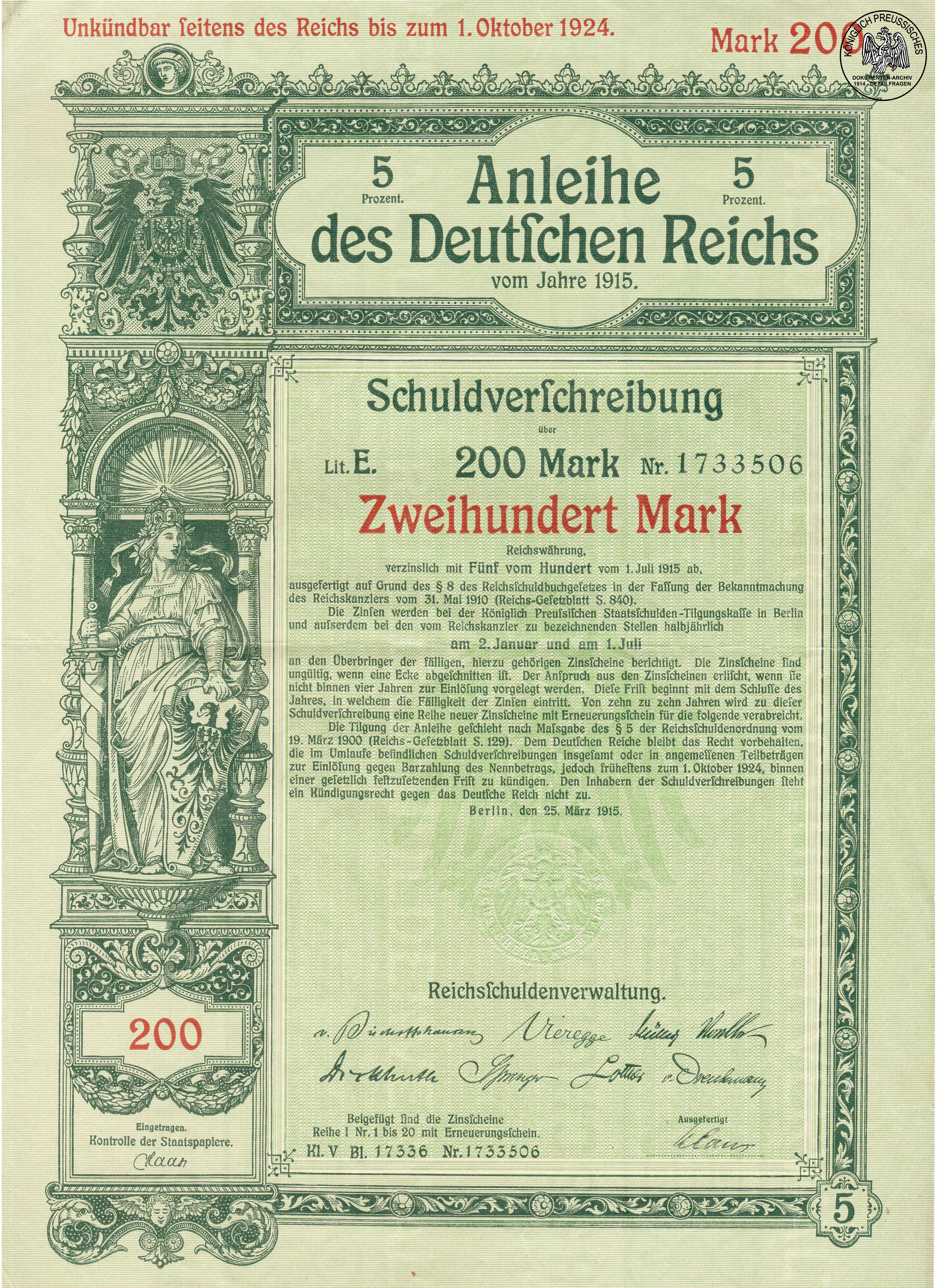 Anleihe des Deutschen Reiches vom 31. August 1915 im Wert zu 100M;Verzinsung 5%Herausgegeben von der Reichsschuldenverwaltung. |