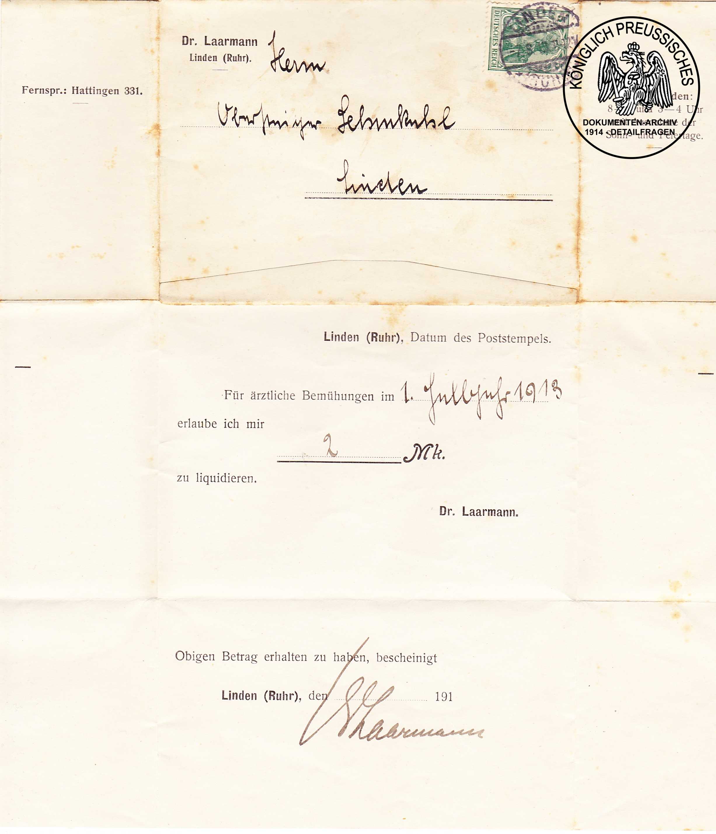 Arztrechnung für den Obersteiger Lehmkuhl die von Dr. Laarmann in Linden (Ruhr) im Halbjahr 1913 erbracht wurden. Mit freundlichen Genehmigung: Anke Bartröver, Dortmund |