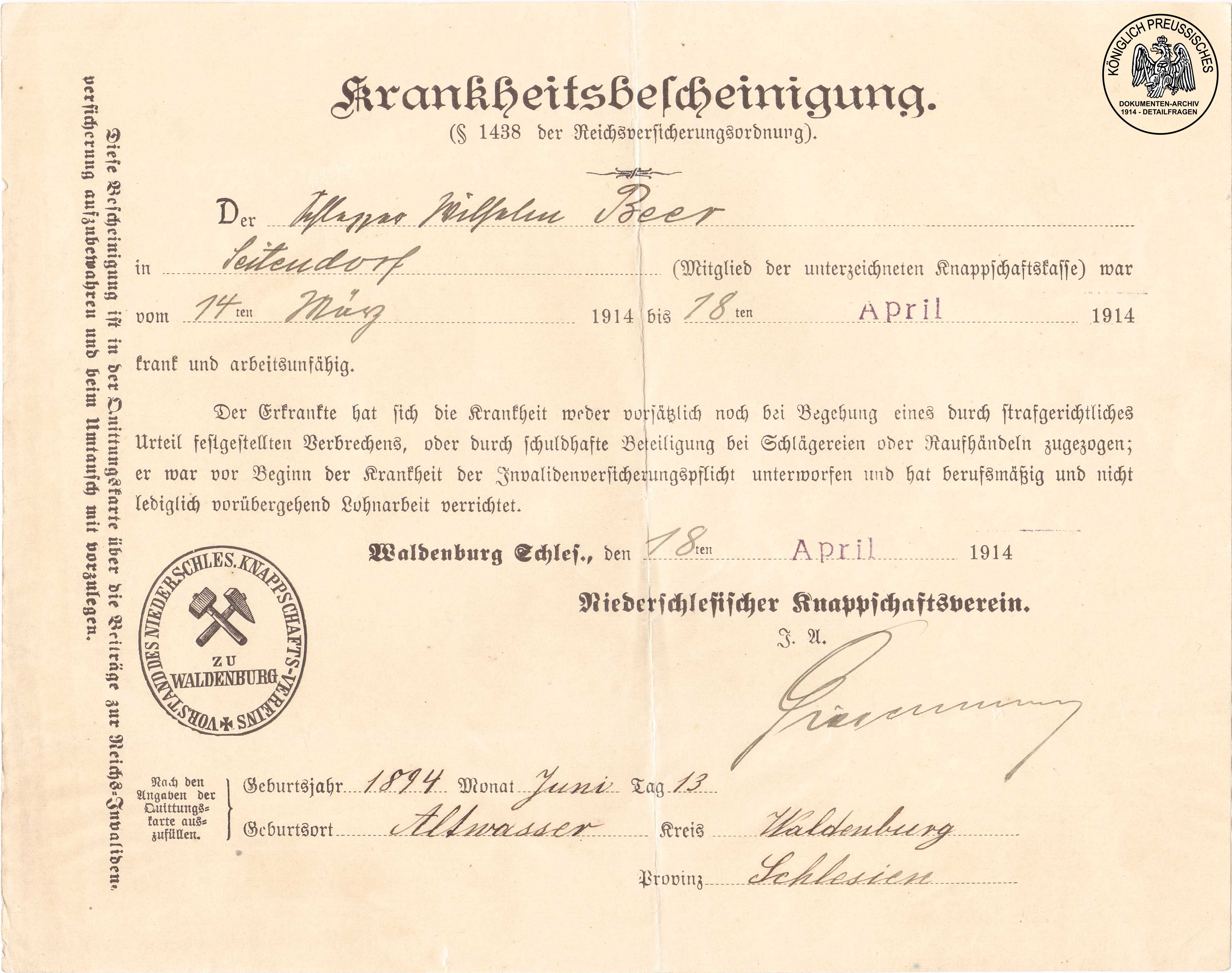 Krankheitsbescheinigung gem. § 1438 RVO für den Schlepper Wilhelm Beer, der in der Zeit vom 14.03.1914 bis zum erkrankt war. Ausgestellt ist die Bescheinigung vom Niederschlesischen Knappschaftsverein. |