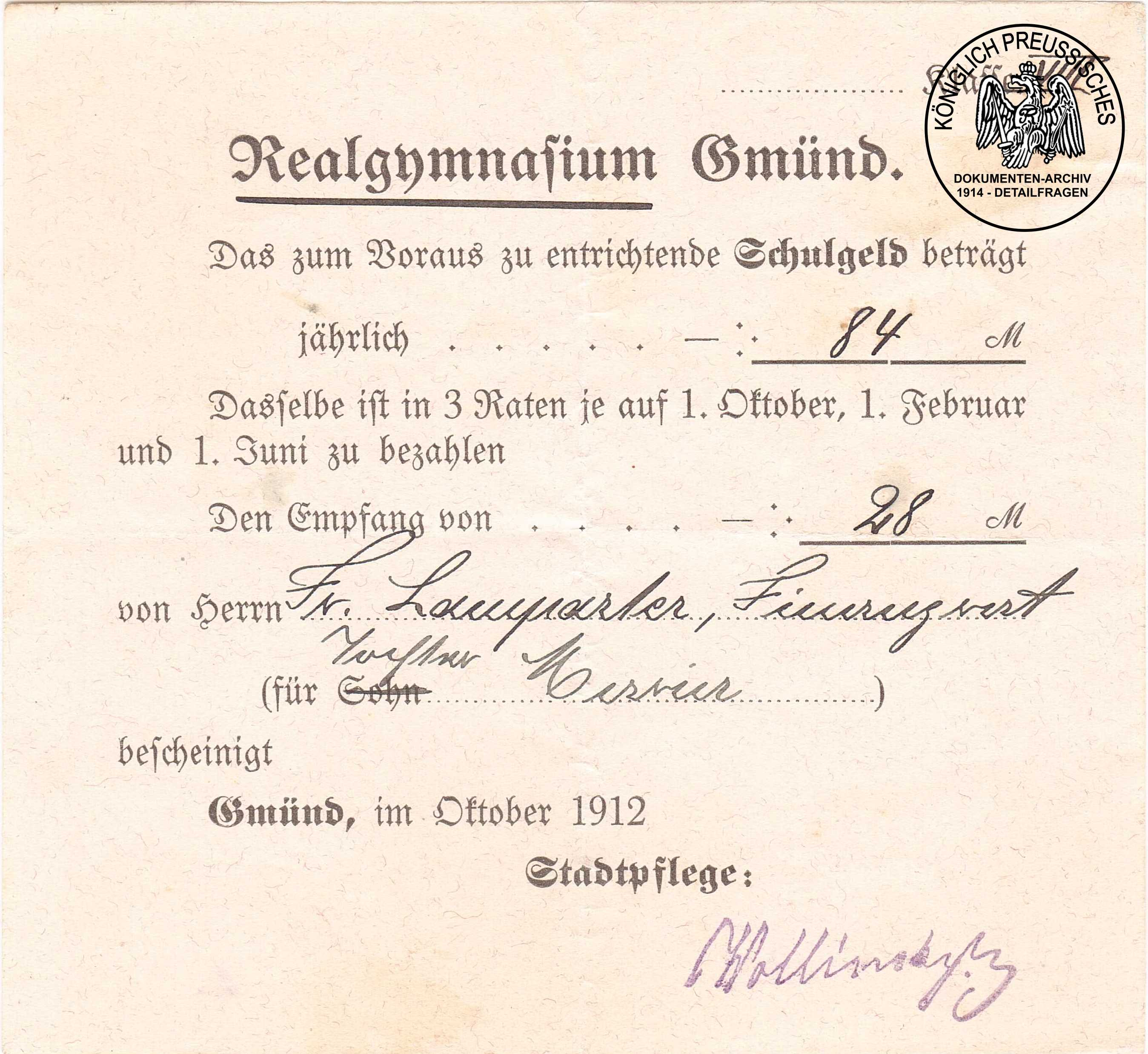 Quittung des Realgymnasiums in Gmünd über gezahltes Schulgeld für das Schuljahr 1912/1913. Das Schulgeld wurde für Maria Laugaster entrichtet und war im Voraus fällig. |