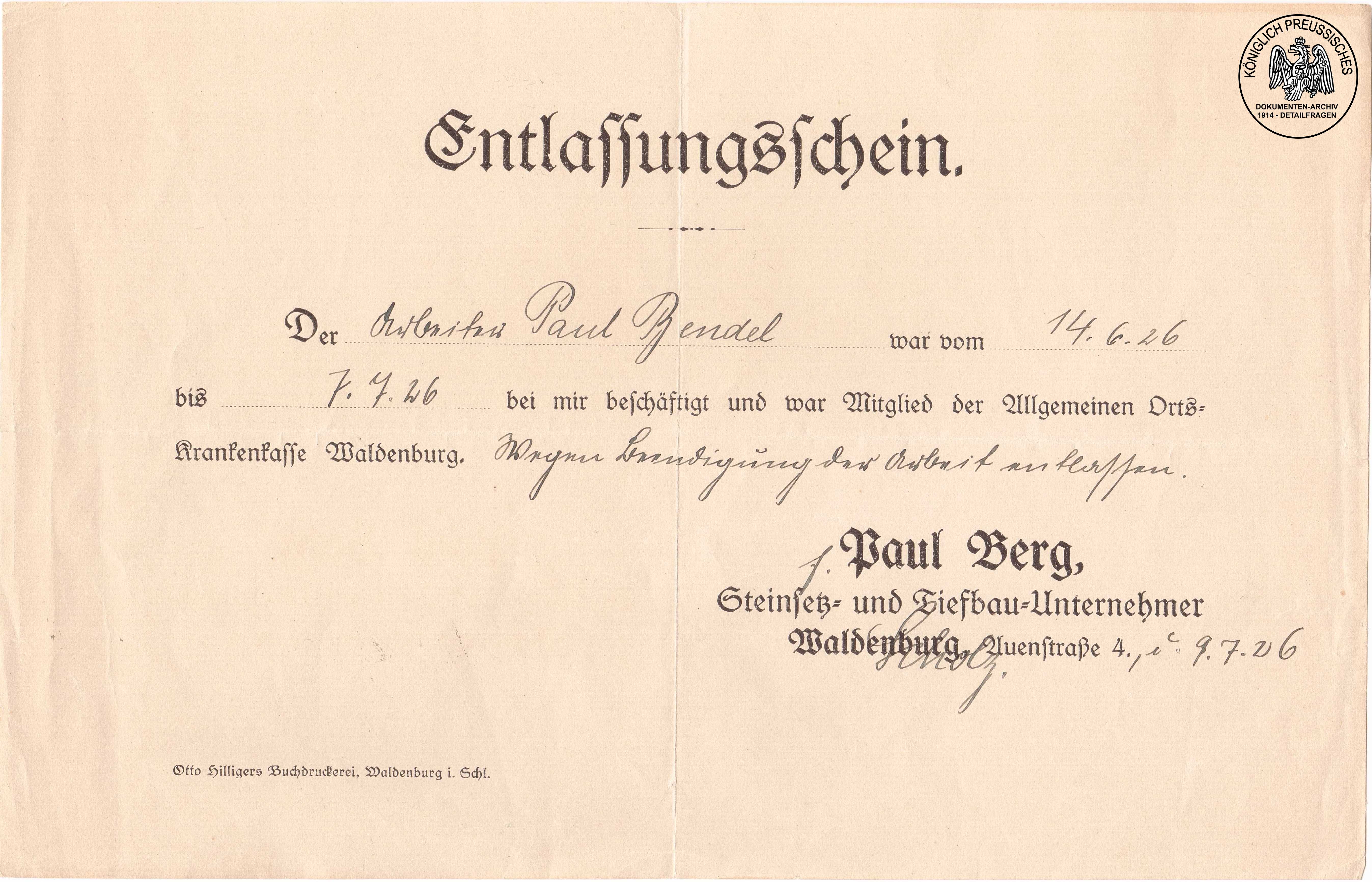 Abschlußzeugnis für den Mauerlehrling Wilhelm Hofmann. |