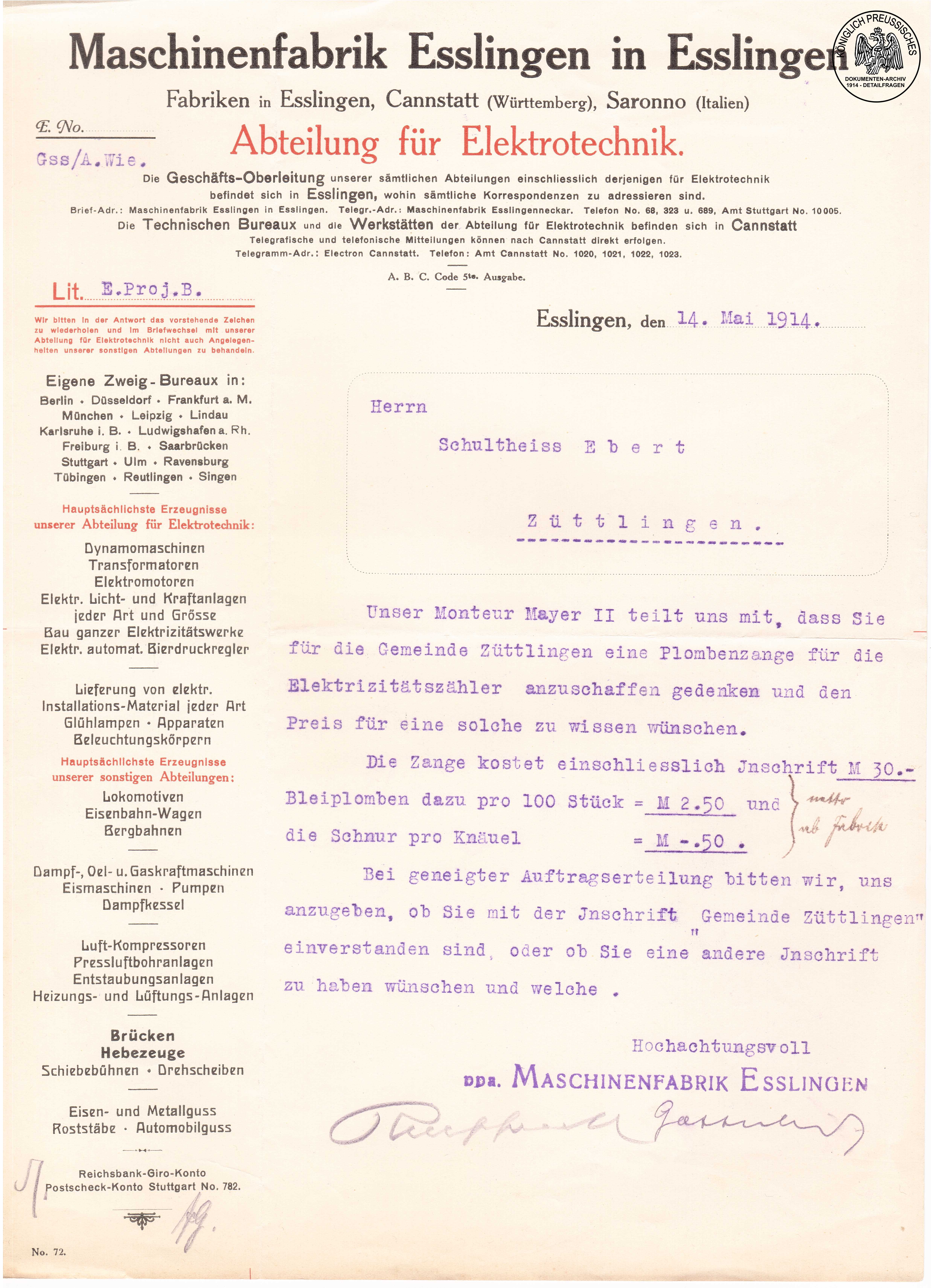 Angebot der Maschinenfabrik Esslingen an das Bürger- meisteramt von Züttlingen über eine Plombierzange für Stromzähler. |