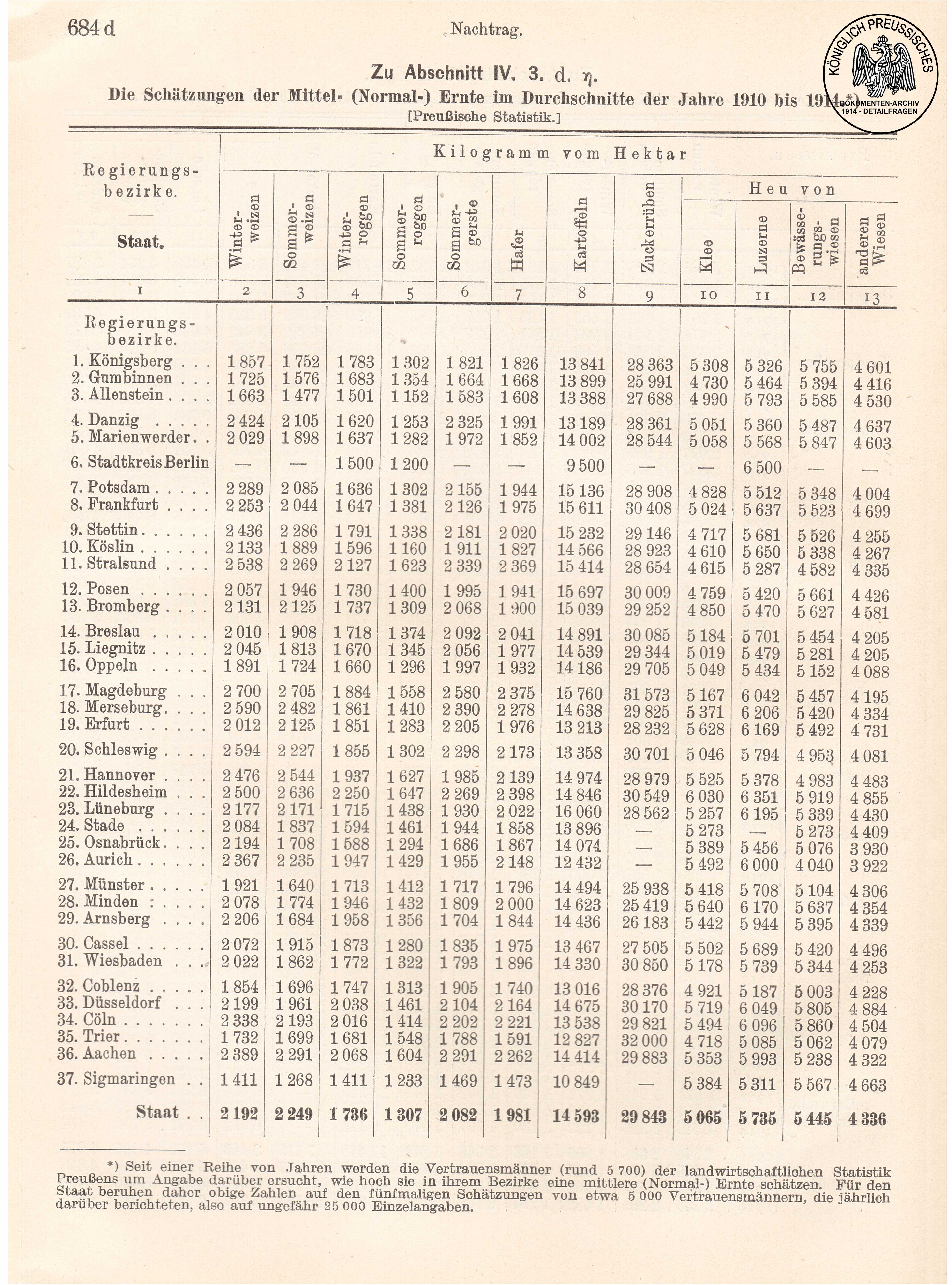 Schätzung der Mittel- (=Normal-) Ernte im Durchschnitt der Jahre 1910 und 1914;die Schätzungen basieren auf den Angaben von 4255 Vertrauensmännern.Erhebungszeitraum 1910 - 1914Detailzahlen zum Ernteertrag. |