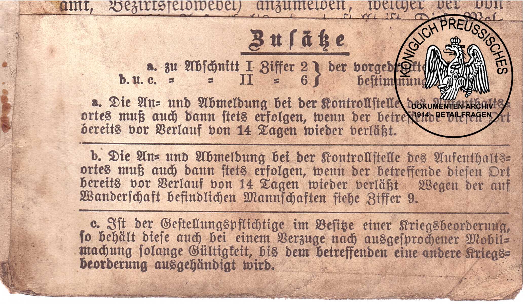 Ergänzung zur Überweisungsnationaleim Militärpass des Soldaten Karl Esser, Niederaussem(als eingeklebter Einleger) |