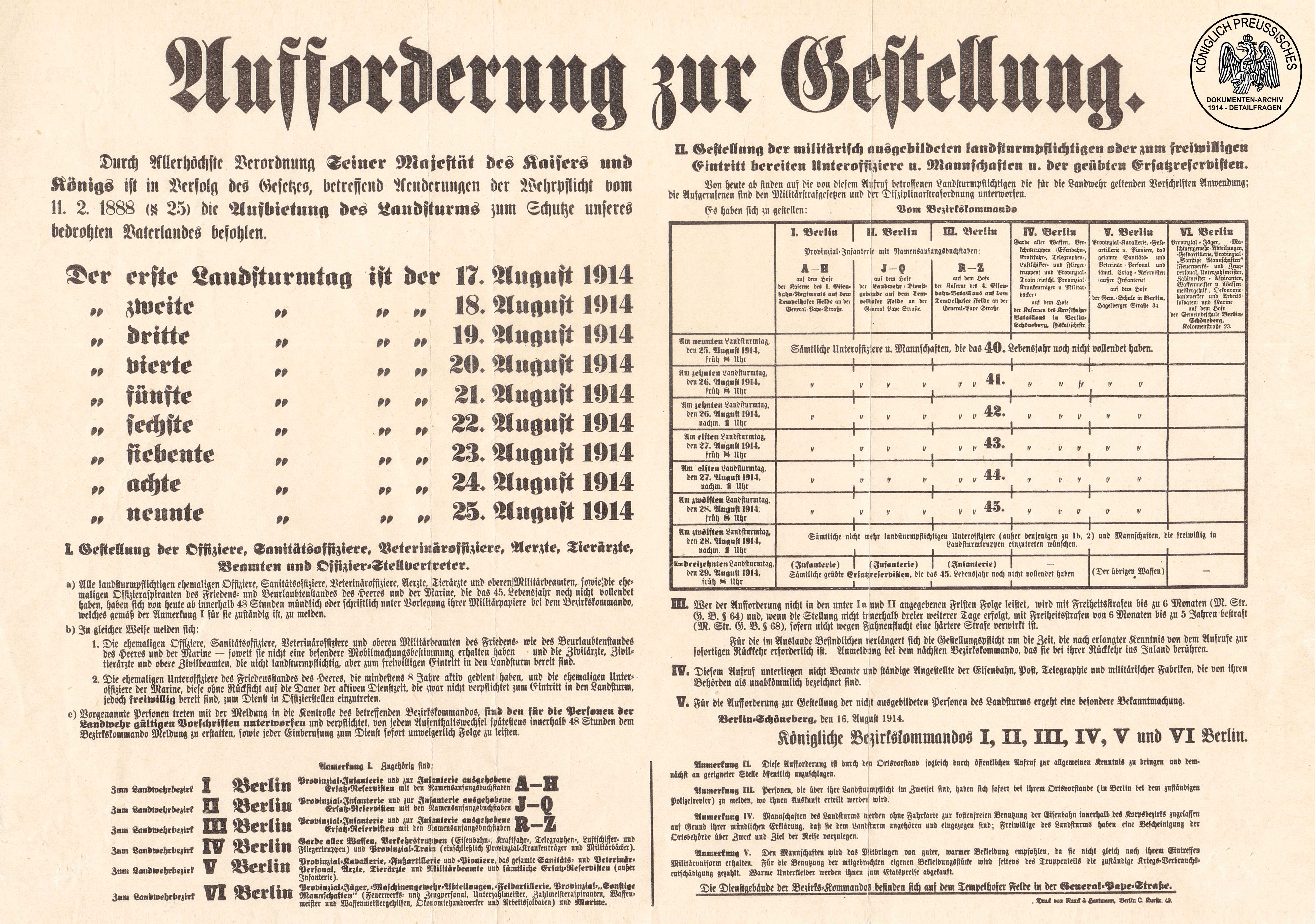 Aufruf an den Landsturm! zur Mobilmachung ab dem 16. August 1914. |
