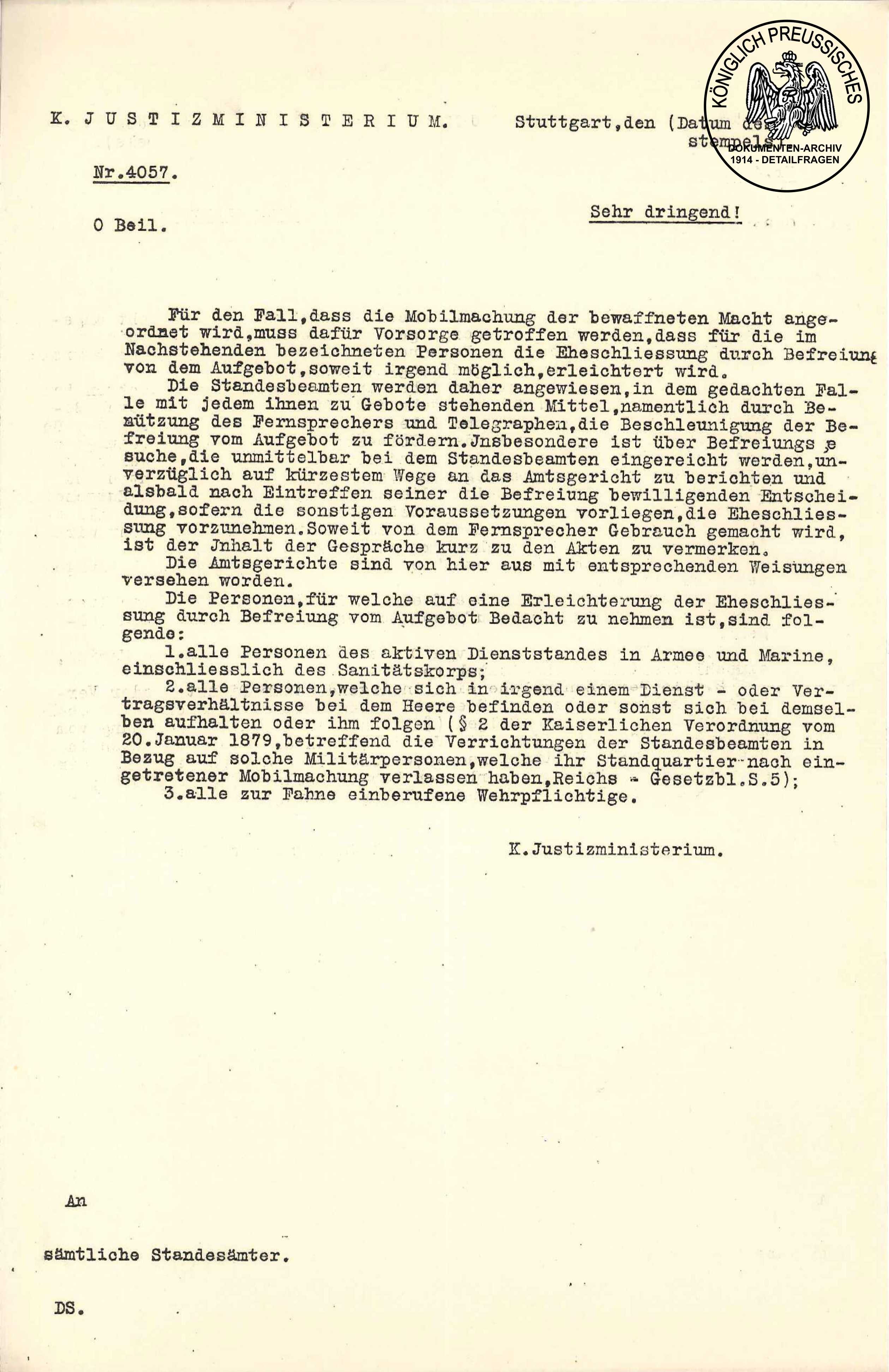 Erlaß des Ministeriums des Inneren des Königreichs Württemberg über die Verbreitung des Mobilmachungsbefehls an die unter- geordneten Verwaltungen. Der Erlaß regelt in welcher Weise die Ämter an der Verbreitung des Mobilmachungsbefehles mitzuwirken haben und welchen Vorkehrungen zu treffen sind. Quelle: Gemeindearchiv Züttlingen |