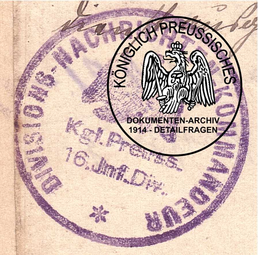 Siegel des Division Nachrichten Kommandeursder Königlich Preussischen 16. Infantrie Division(aus einem Soldbuch) |
