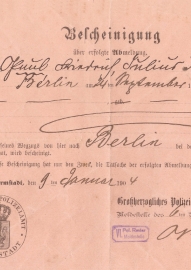 Geburtsurkunde für Georg Carl Wolf, geboren am 25.10.1899. Interessant hierbei ist, daß es sich bei Georg Carl wohl um ein uneheliches Kind gehandelt hat, was man den zusätzlichen Anmerk- ungen entnehmen kann. Bei der Urkunde selbst handelt es sich um eine exakte Abschrift der Originalurkunde vom 04.11.1899. Die Kopie wurde vom Standes- amt Hamburg 2 am 23.04.1925 gefertigt. |