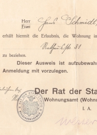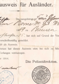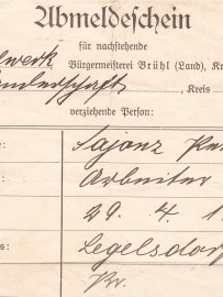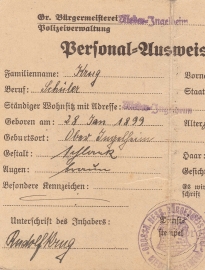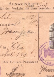 Ausweis für den Verkehr mit den besetzten Gebieten für den Schüler Johannes Brühl; ausgestellt von der Polizeiverwaltung in Köln. |